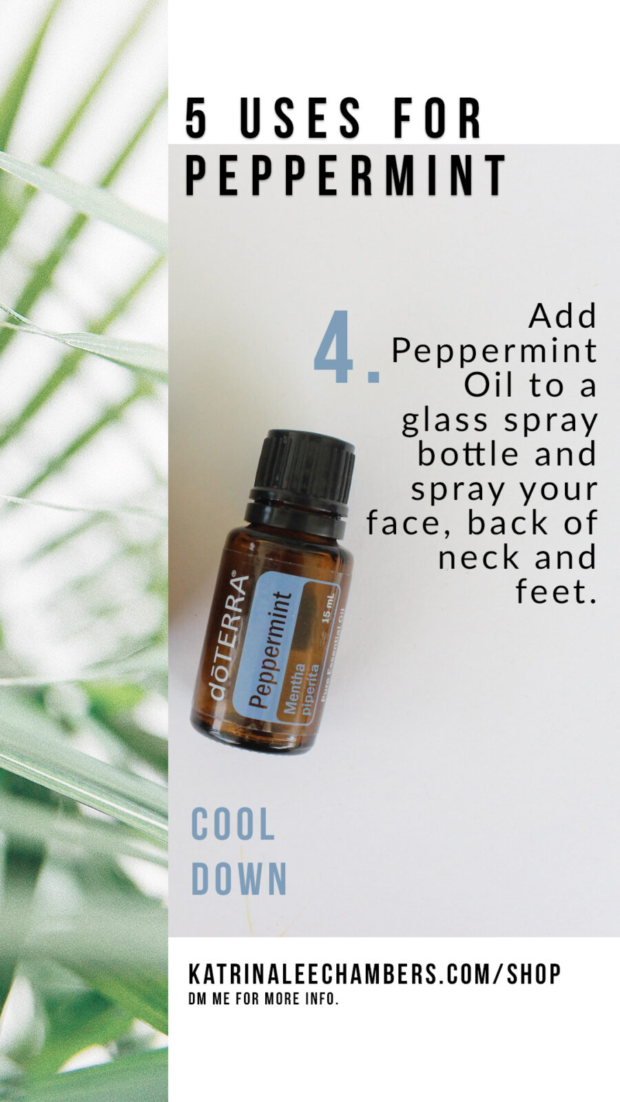 - Need to cool down? Add Peppermint Oil to a glass spray bottle and spray your face, back of neck and feet.