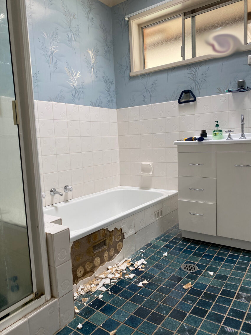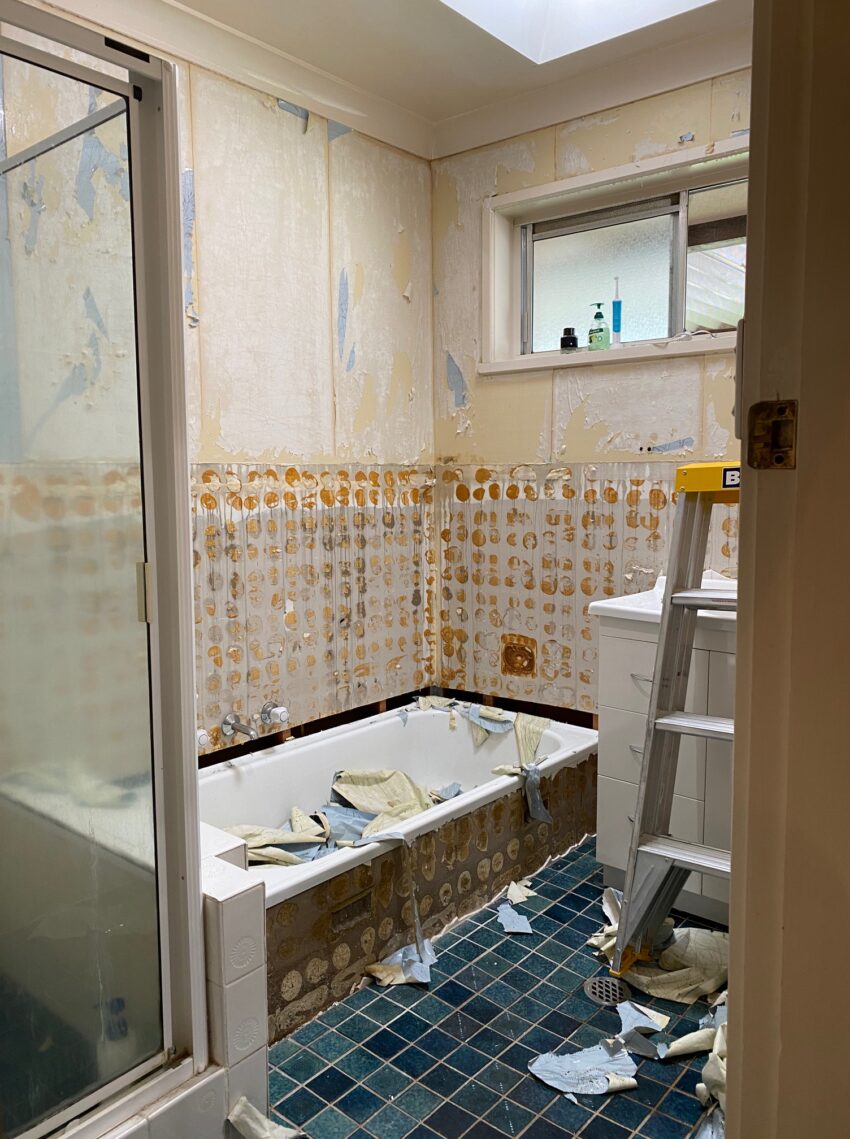 I’ve decided that it’s just much easier for every trade (and myself) to strip a bathroom like this entirely. It’s better to start from scratch. It’s more time efficient and new villaboard is so much cheaper than mucking around with old walls (asbestos) and the tiler will love you for it!