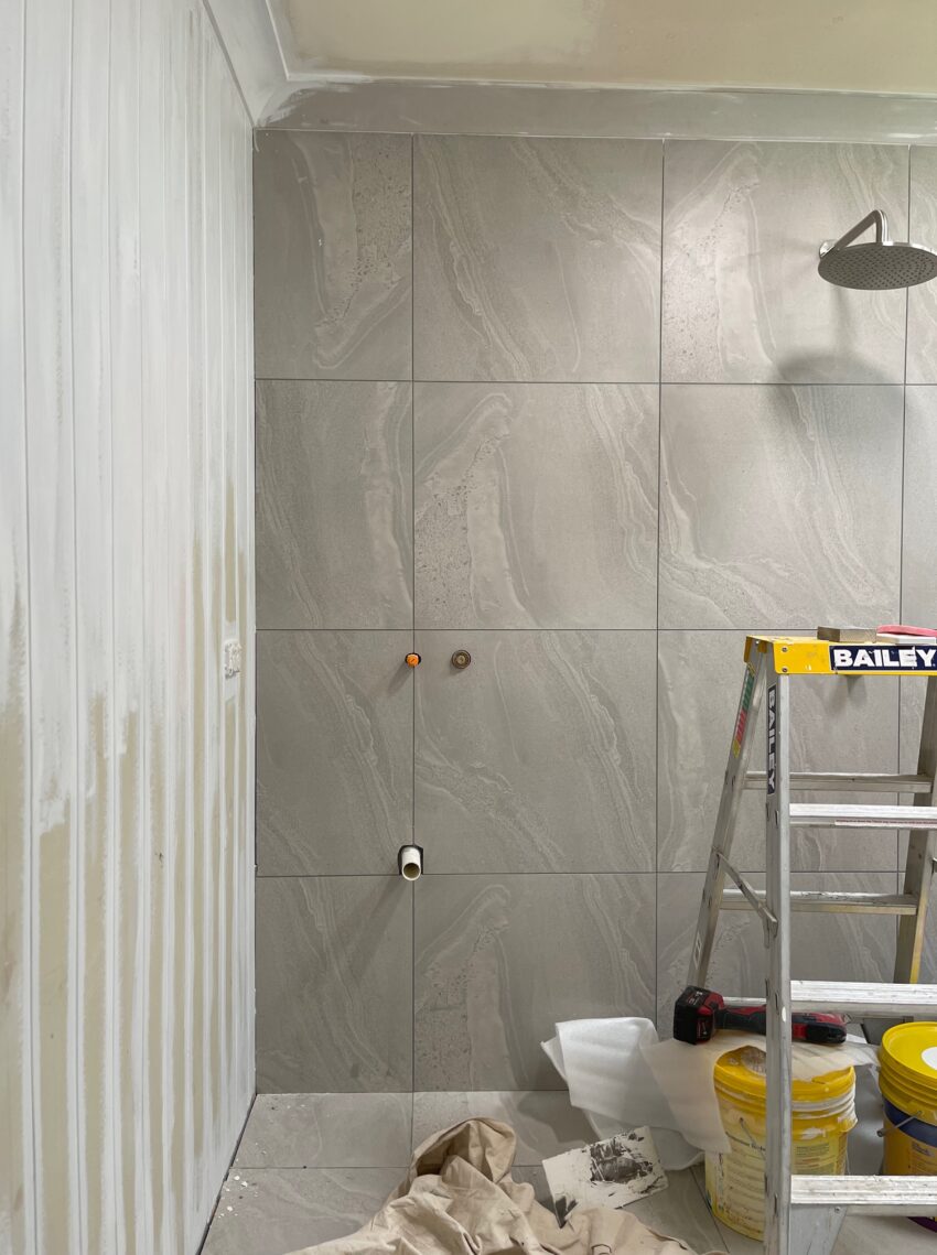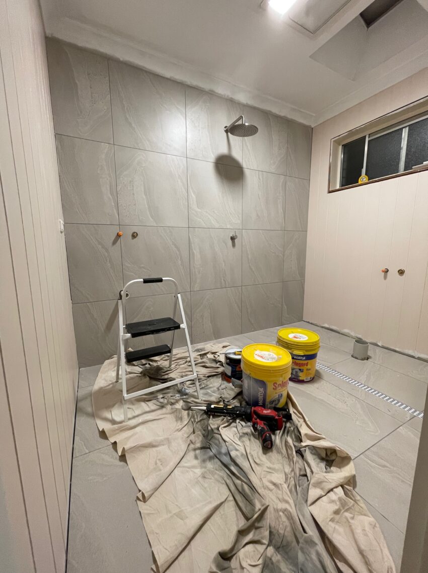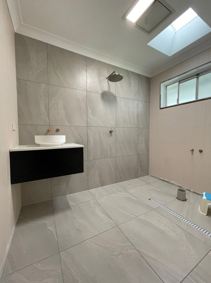 After the demo and clean up all got taken care of, it was time to straighten some frames. My chippy friend did this. Then all the walls were re-sheeted, weatsealed and I added the external VJ wall panels to 3 walls (in place of tiles).