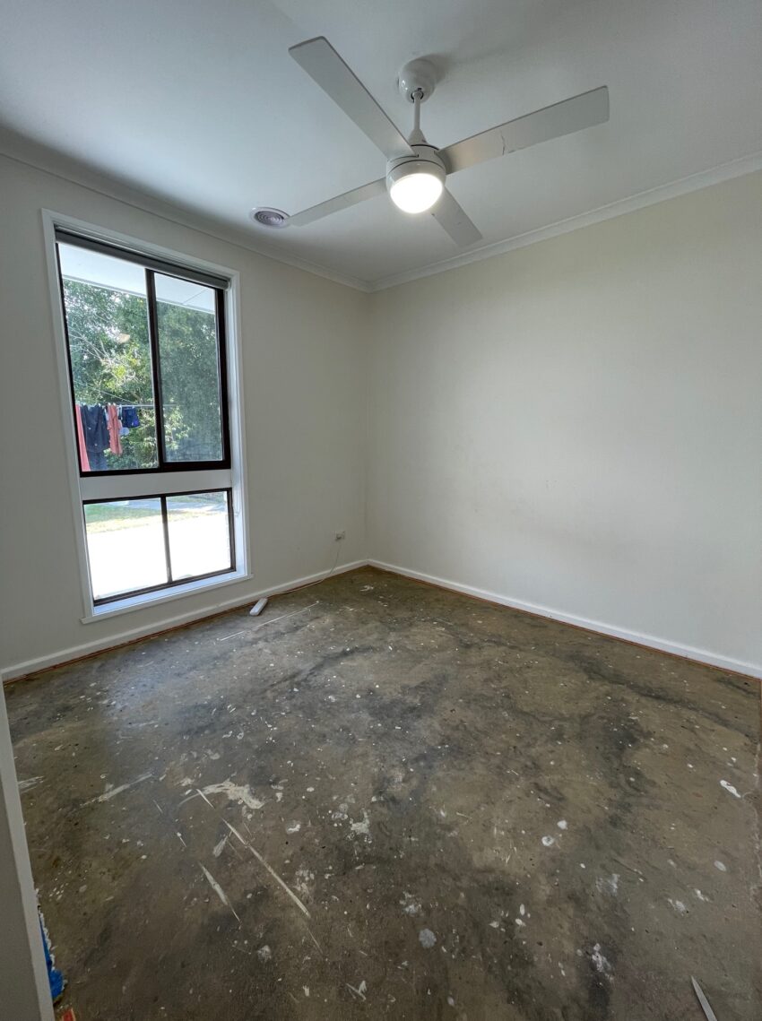 I took the carpet out of this room because it’s so small and ran the vinyl flooring all the way through, just to make it feel bigger. The room still needs skirting boards and a white shutter over the window.