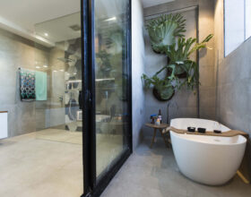I wasn’t a fan of this one. Take out all the plants and I think it’s very average. I am not loving the leather couches?? And the feature wall with a mirror and the orange timber bookshelves is not my taste. It’s not outdoorsy with shelving and a dining table – more suited to an interior space. They scored 25/30.