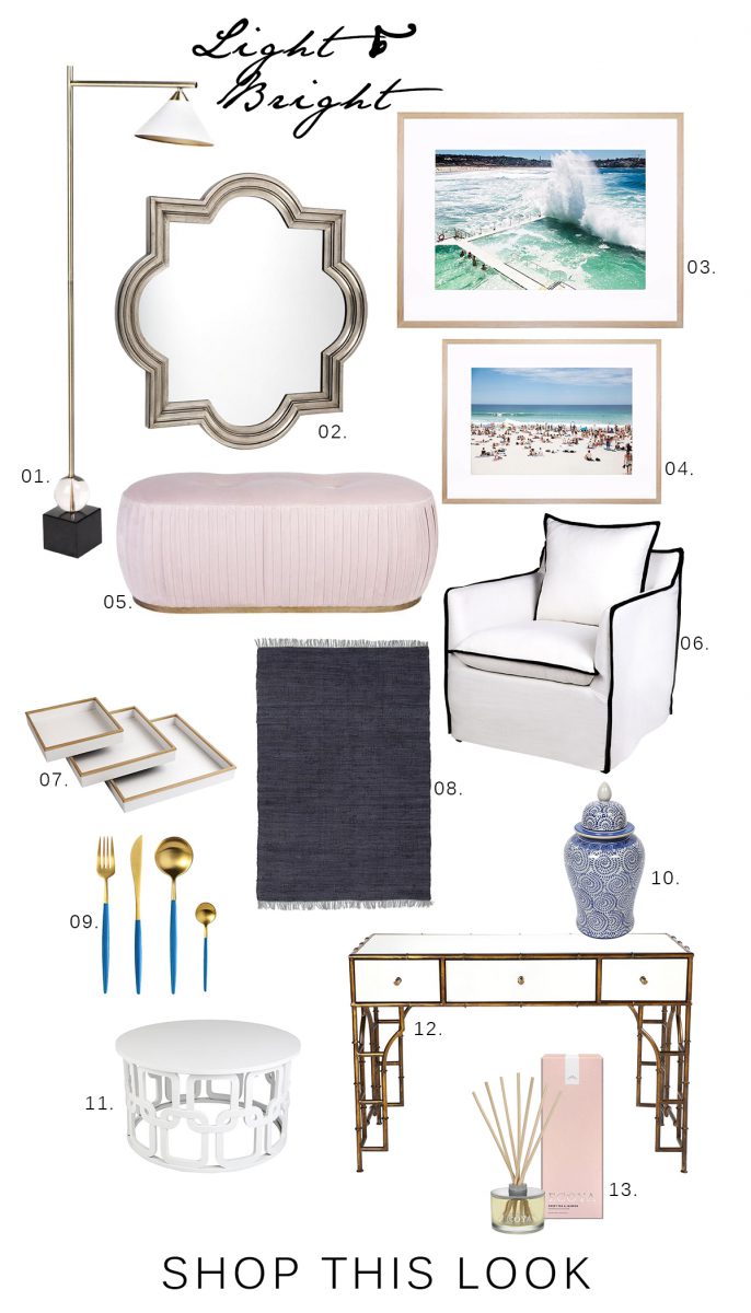 01. Floor Lamp / 02. Pendant Light / 03. Trays / 04. Armchair / 05. Table Lamp / 06. Candle / 07. Jar / 08. Floor Rug / 09. Console Table / 10. Ottoman / 11. Artwork / 12. Artwork / 13. Mirror
