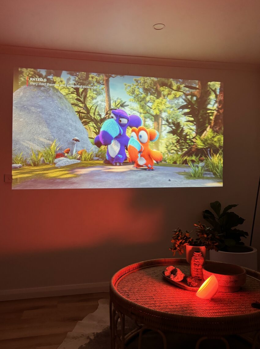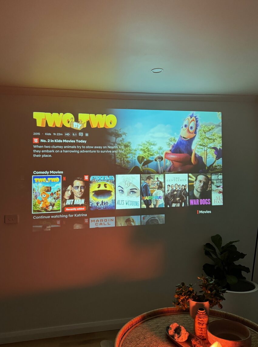 Another fantastic feature is the projector’s ability to create a huge screen from a small distance. With only 1.5 metres needed to project a 50-inch screen, it fits seamlessly into any room. It can project up to a massive 200-inch screen if you have the space! For the best experience, I recommend using it in darkness and projecting onto a white wall.