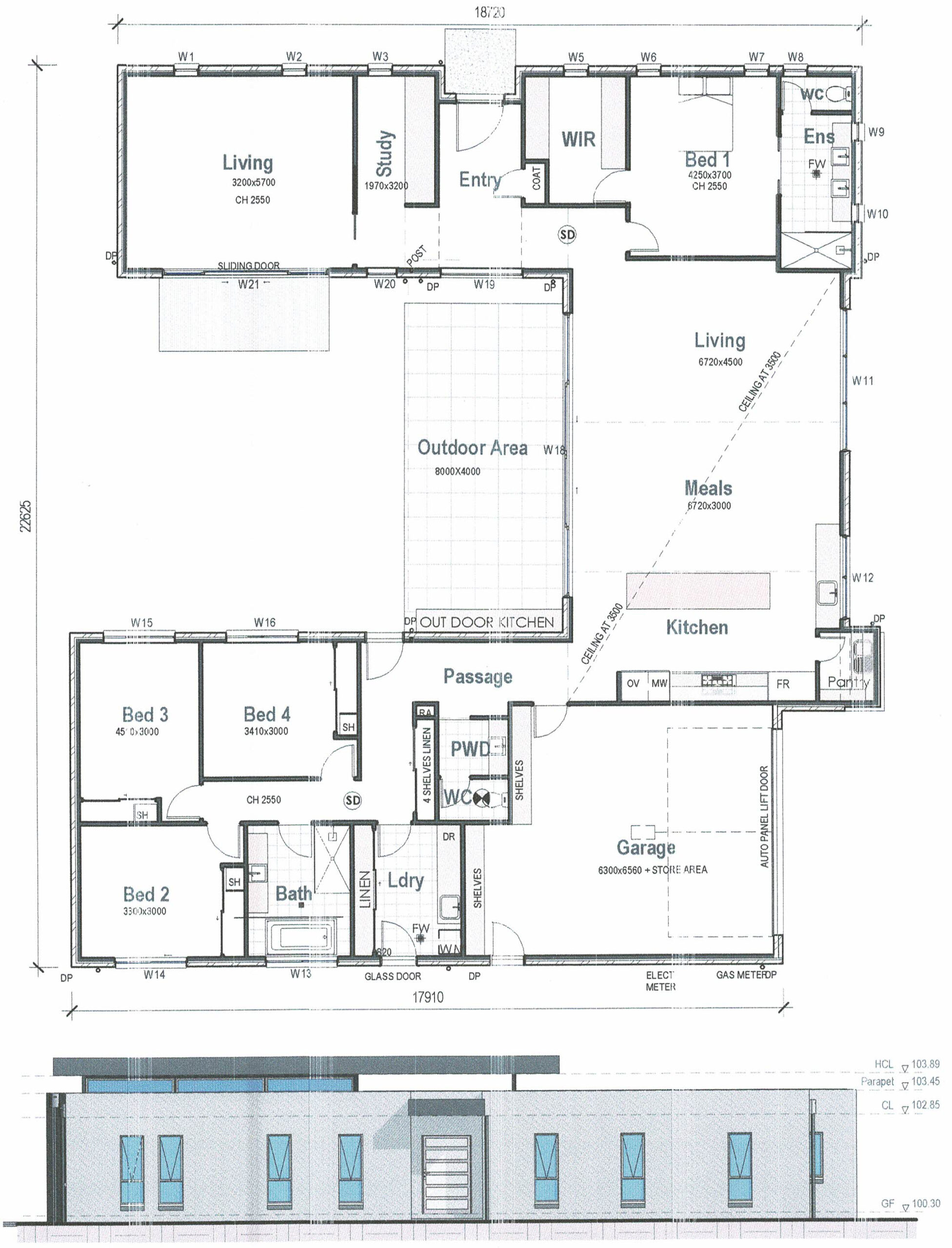Check out this new floor plan today! Found it on a real estate page here (you can see interior pictures too). There's lots to like about this one. Especially the outdoor area off the living and the kitchen. It's a very modern facade, but with the right interior you could make this home something special. …