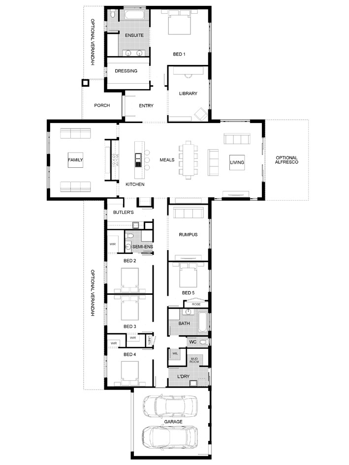 If you have plenty of land and are looking to build a big family home then this plan would be a treat. This one boasts 5 bedrooms, 2 living areas, plus a rumpus and a library. You definitely won’t be short on space with this one.