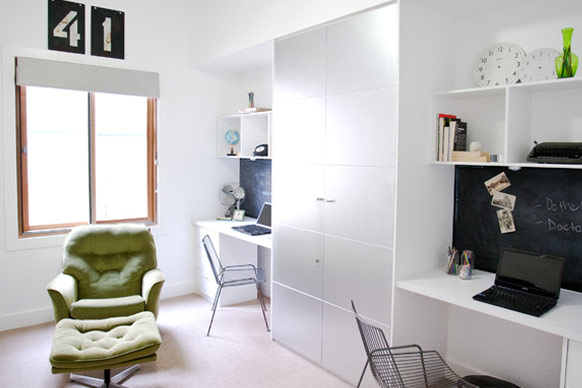 As we will be down-sizing I imagine we'll be consolidating our two spaces into one and your alternative of providing separate work areas with stacks of storage looks like pure heaven to me {I'm a neat freak, my partner…..not so much!}.