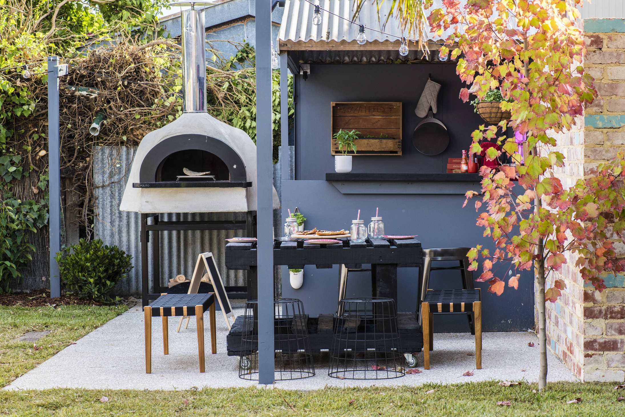Initially this looks pretty cool doesn’t it? I like the pizza idea and the neon light and the moody colours. The graffiti is awesome too. I like that! But again I have some issues. I cannot even stand the pallet outdoor table. You won’t be able to sit at that comfortably. Your shins will be very unhappy. Don’t forget to lock the castors in place either or you’ll be chasing your pizza around. There is so much use of the decking. I get that it’s more efficient and quicker than pouring concrete, but the maintenance will be horrendous. Again, there’s so many inside pieces of furniture sitting outside (like dining chairs!). Where is the shade?? The raised decking/dining space would never get used at my house unless we all wore hats and sunscreen and the temperature was 21 degrees and there was no rain or wind. Not practical. I do like the fire pit though. I could have one of those at my house. It works well in this space. I also love festoon lighting, so this space overall wasn’t too bad.