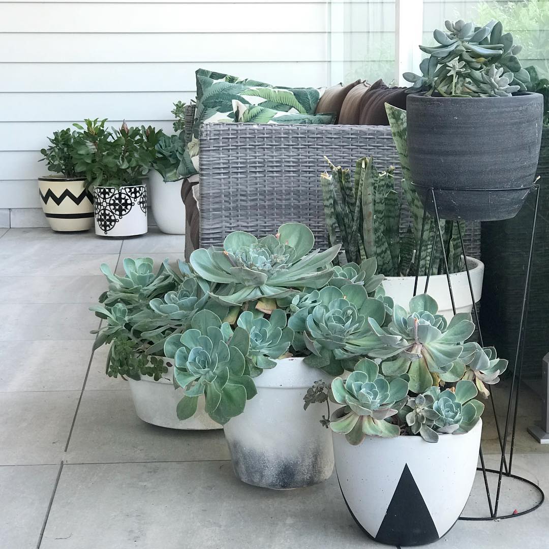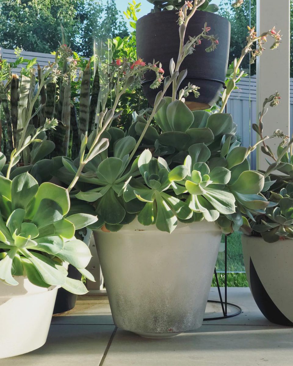 Succulents are designed to withstand drought, so what they love is a really good soaking (at the soil level – so I poke a watering can through the middle of the succulents in the pots). They think they won’t be getting any more water for a while so they soak up the water and store it. This means they can last a while without another water.