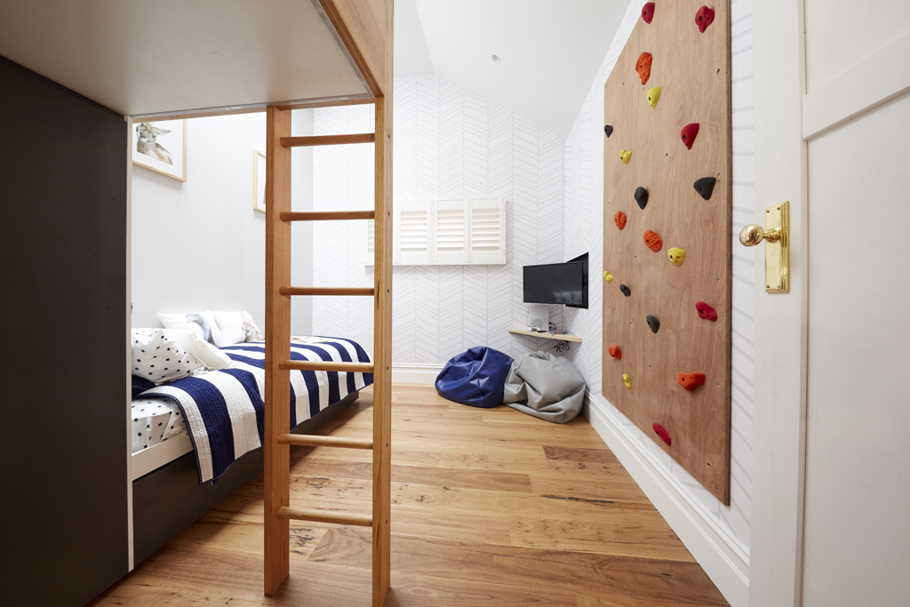 Not sure about this room from Sticks and Wombat! I have 3 boys and that climbing wall wouldn’t be a thing in our house. The overall concept of creating a bunk, a reading nook and a gaming area is good. But I am not sure it all flowed and worked well in this design. What’s the panel above the bed with the little light? Would a child be able to reach that without falling out because those bunk sides look a little low! What did you think of this room? And yes or a no in your house?