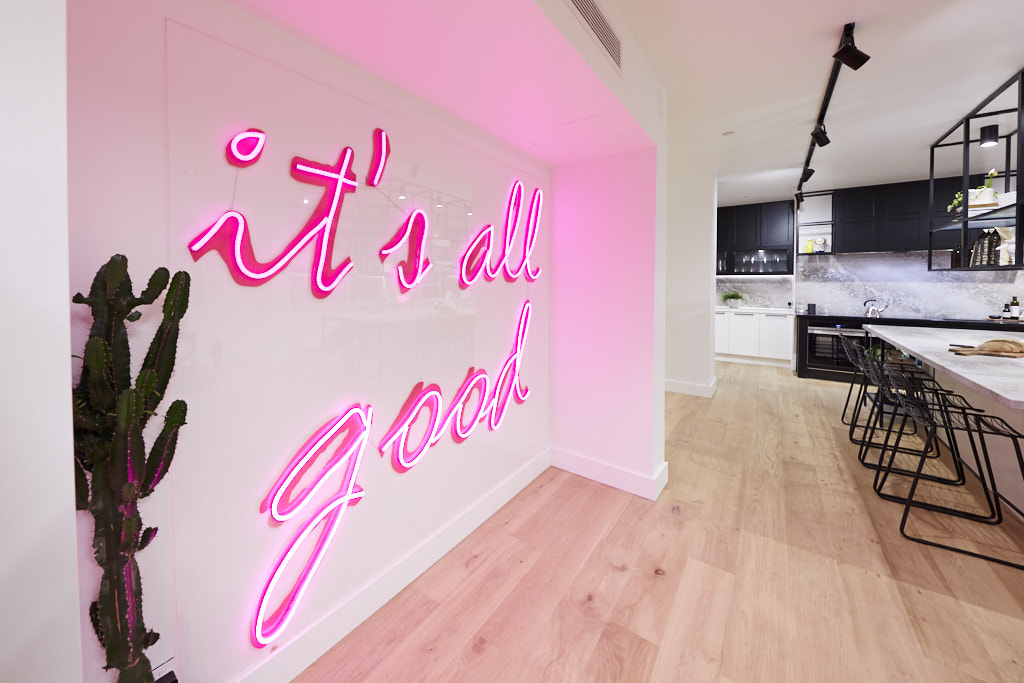 Turns out, it really was ‘all good’ for our sunny Queenslanders after Sunday’s reveal, with the judges loving their bright, bold dining area. They loved the custom Christian Cole round table and leather chairs, they loved the gorgeous pendant light, the quirky trinkets and that gorgeous Palm Springs artwork. But most of all – they loved that enormous neon sign.