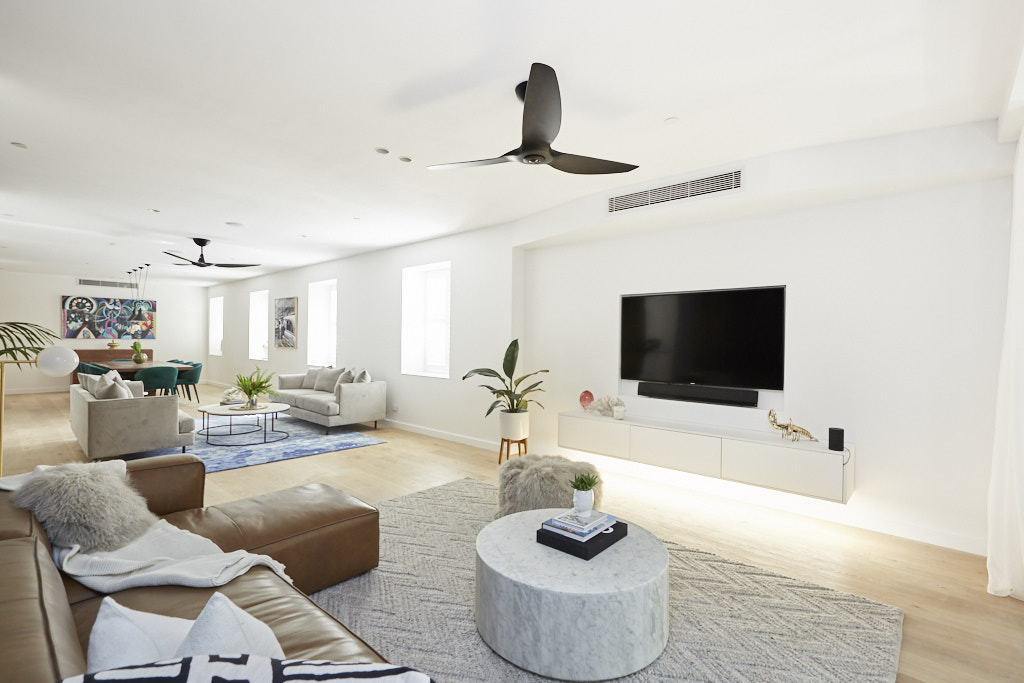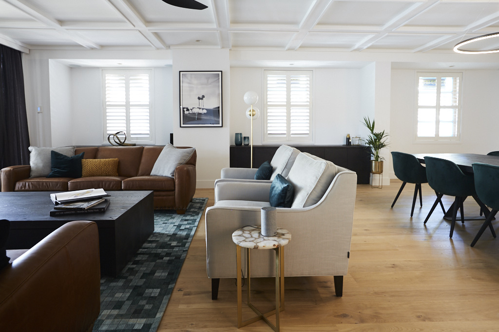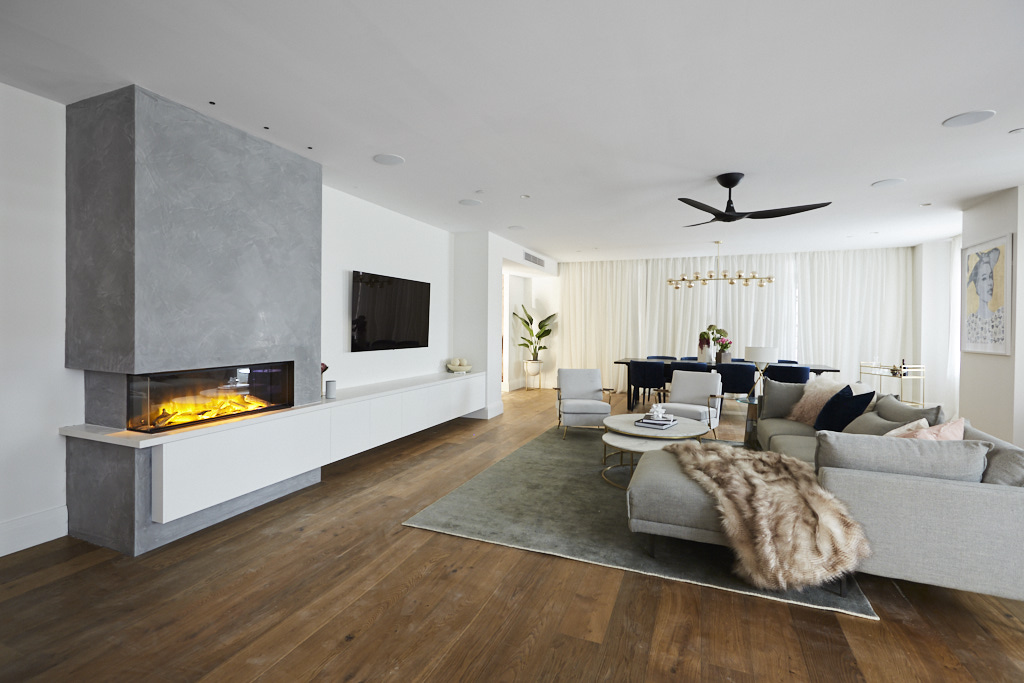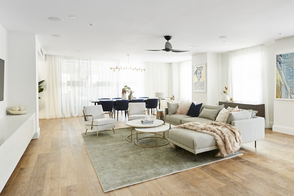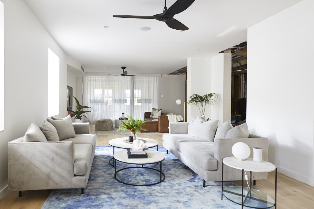 Sara and Hayden produced a relaxed, contemporary living space, which featured an electric fire, comfy oversized couch, marble coffee tables and accents of brass an blue.