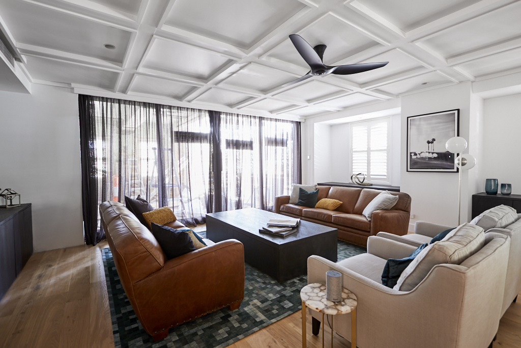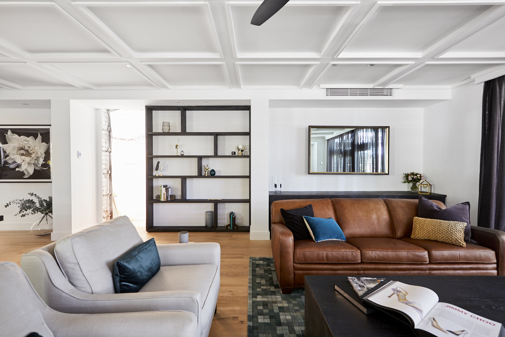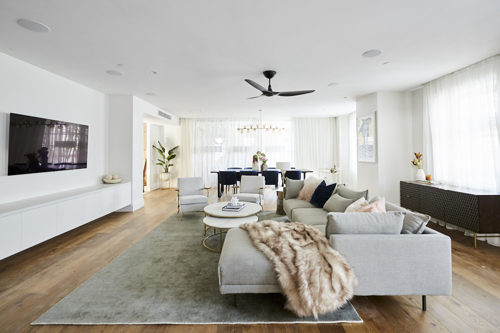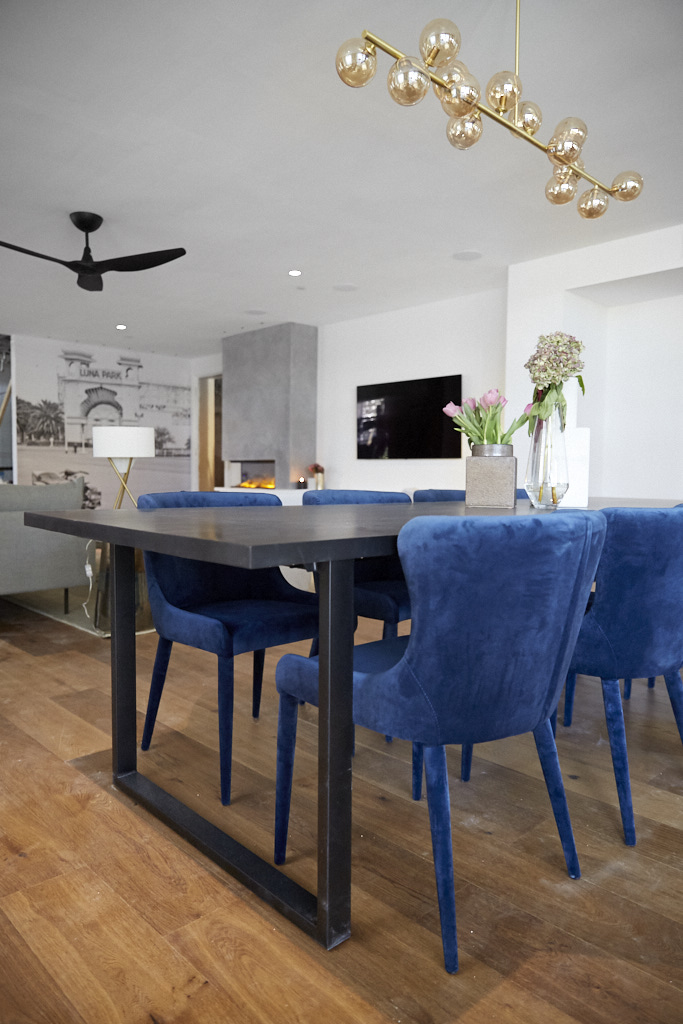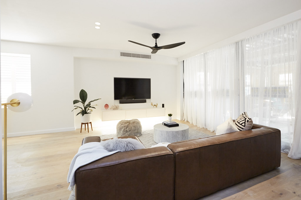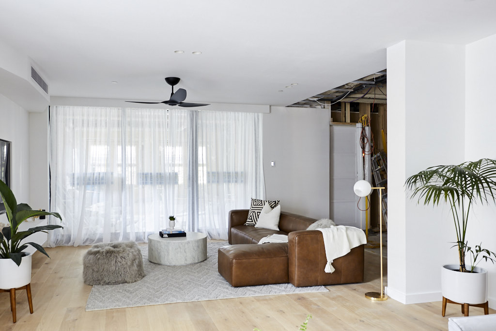Sara and Hayden produced a relaxed, contemporary living space, which featured an electric fire, comfy oversized couch, marble coffee tables and accents of brass an blue.