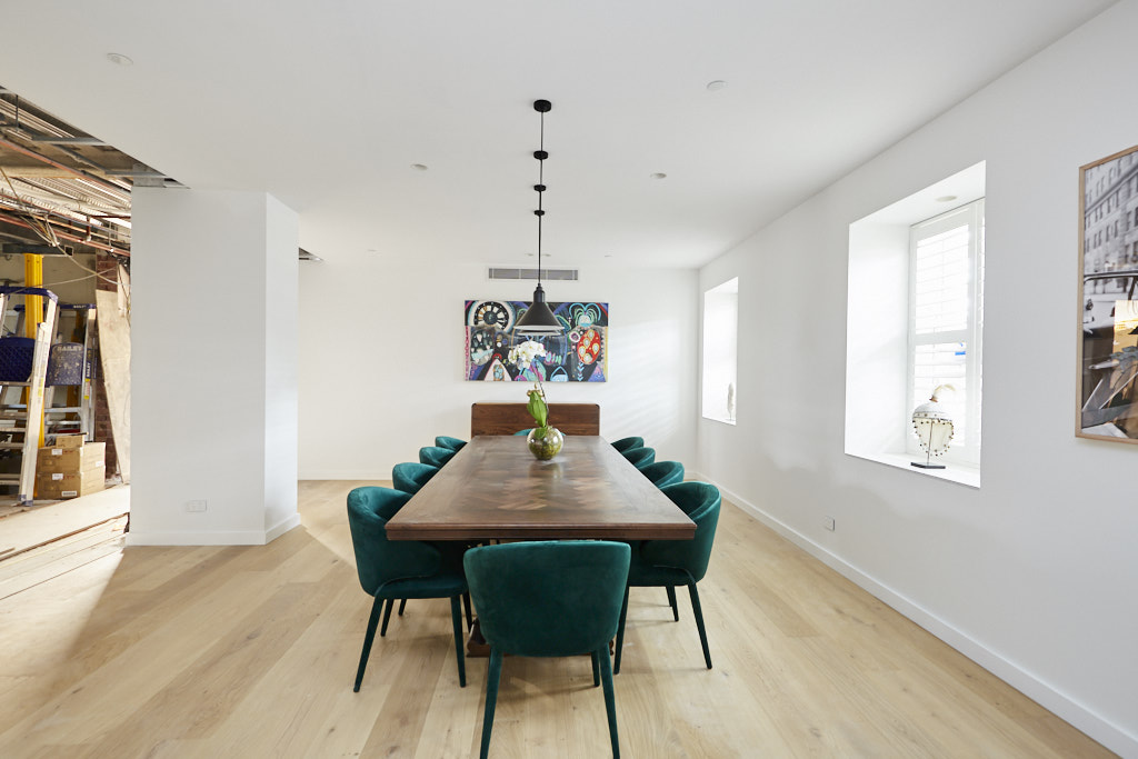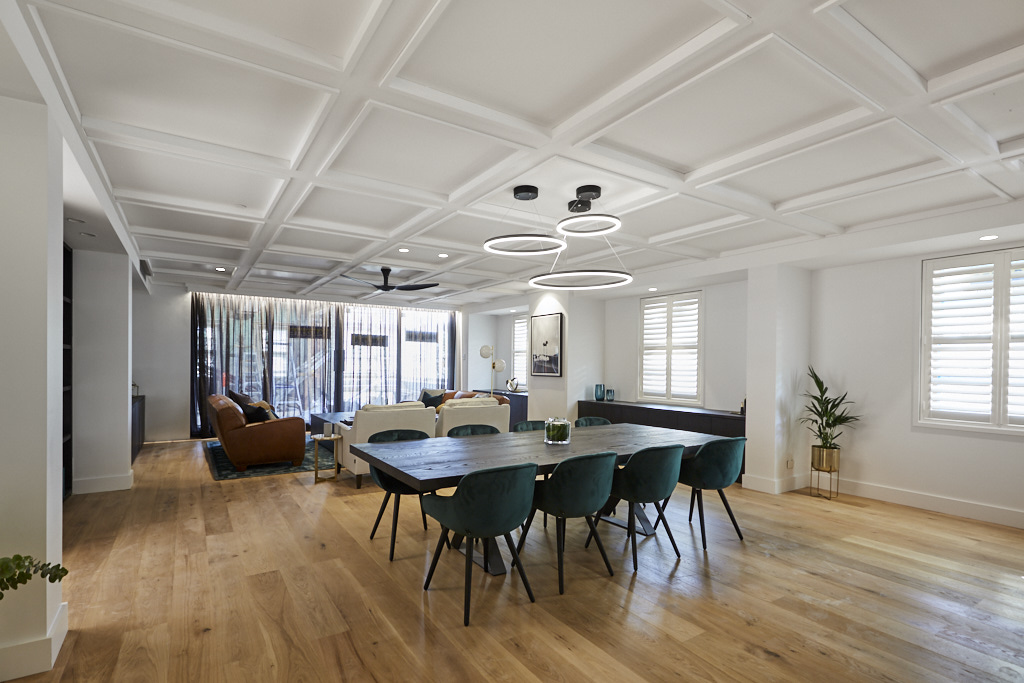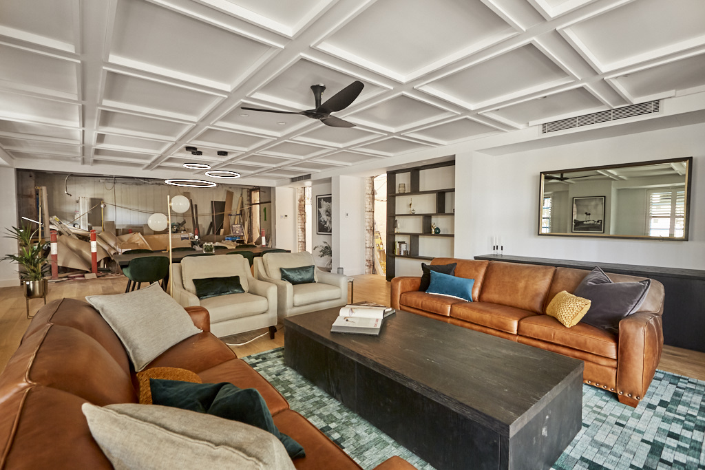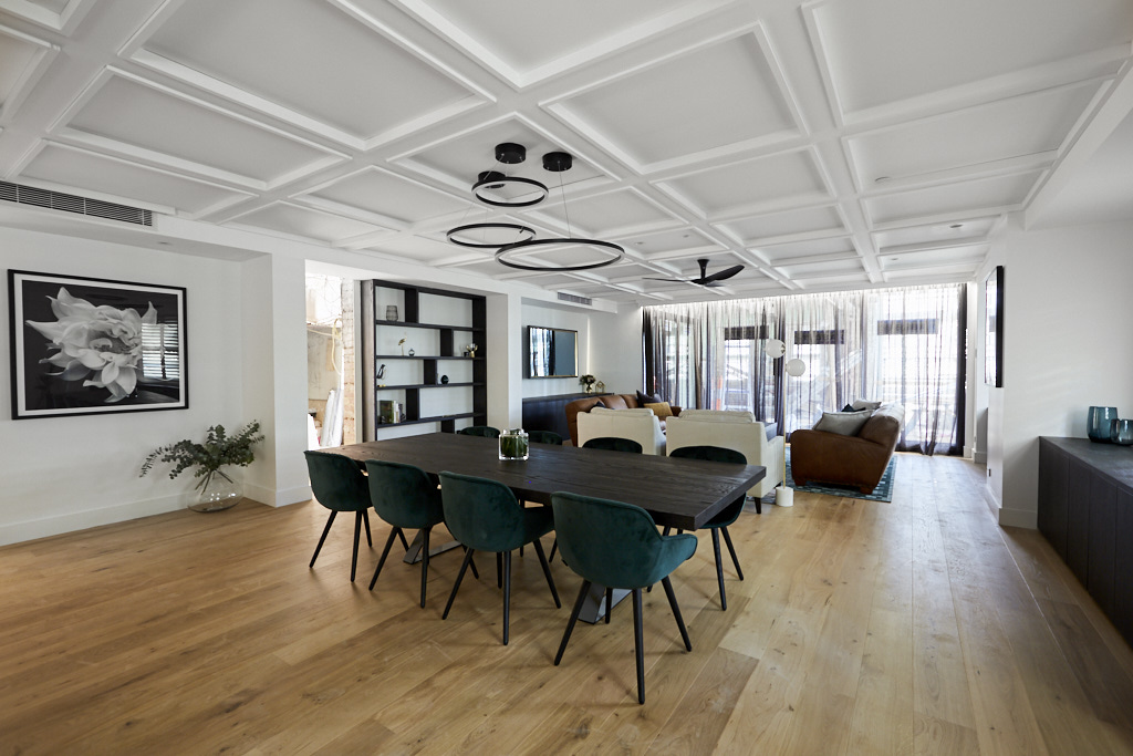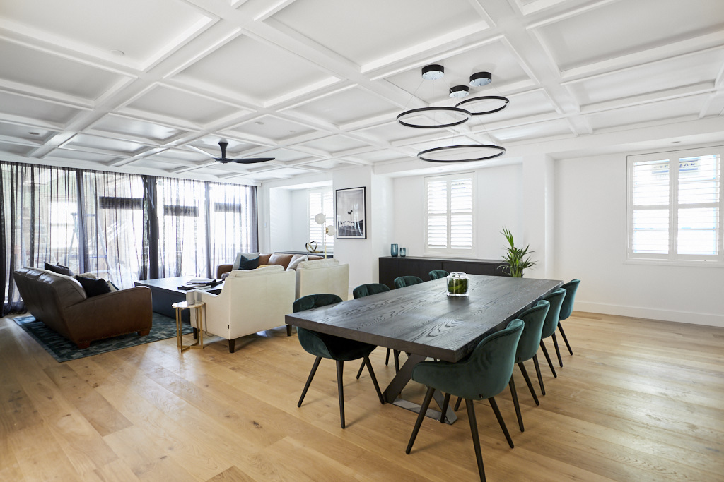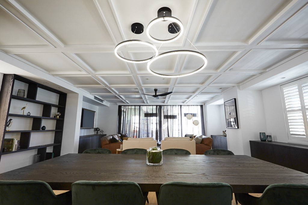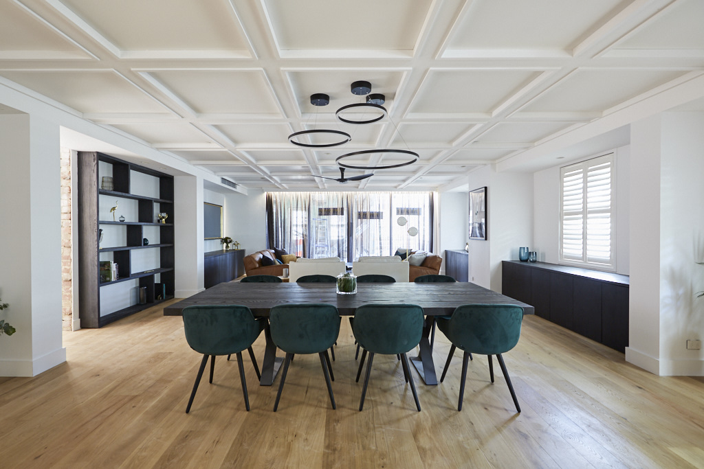 Kerrie and Spence’s living room set itself apart with that stunning coffered ceiling. It also featured a large eight-seater dining table with green velvet chairs, leather lounges, hanging neon disc lights, more of Spence’s beautiful signature joinery on the bookshelves, and one absolutely stunning oversized rug.