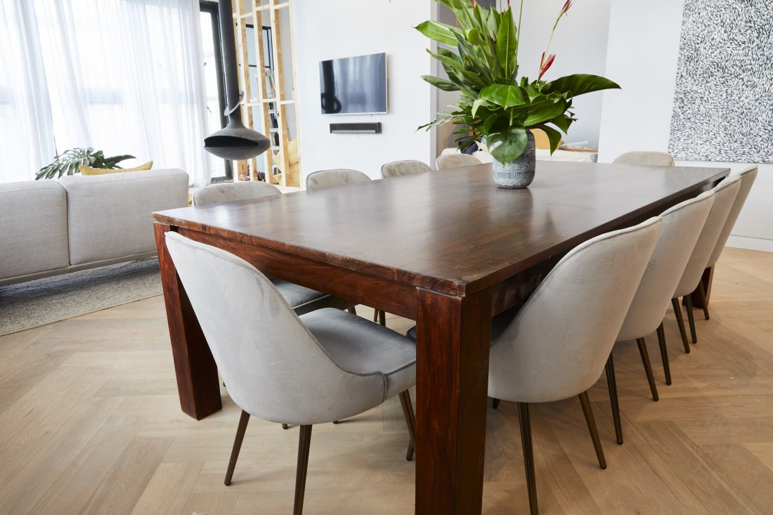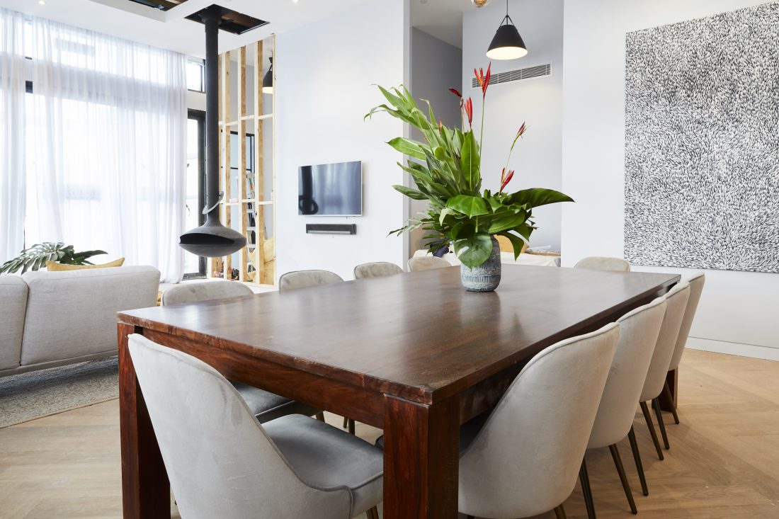 The Queenslanders up in the penthouse had the toughest job of all this week – moving that enormous fireplace and swapping out their “mean-sized table” for something more space appropriate. In the end, they did both these things, and also added a new contemporary couch and a statement light above the table to the space. Shaynna was impressed, saying, “Now that’s what I want to see!”