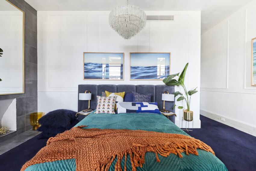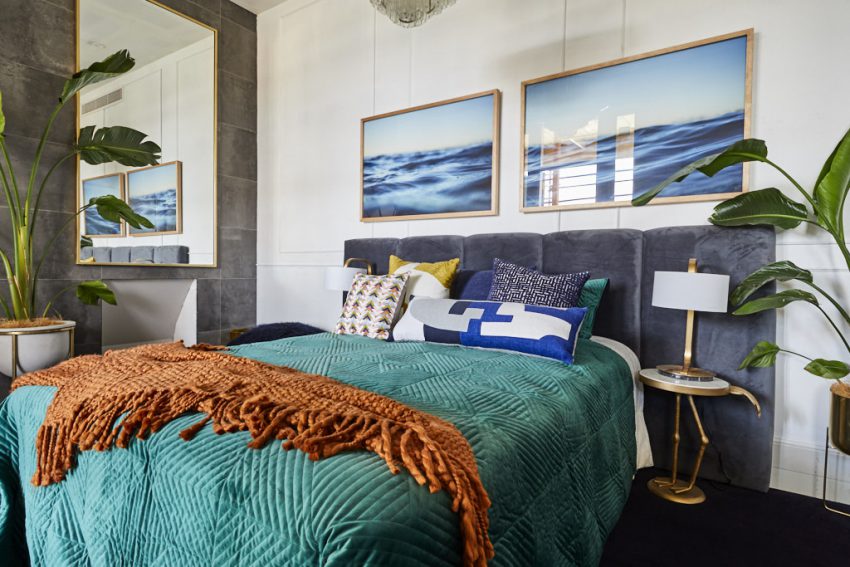 “It’s palatial,” Neale said, upon walking into the first guest room, which featured sky-high ceiling heights and a sumptuous palette of slate grey, greens and blues, which worked against a stunning tiled feature wall beautifully. The judges thought it exuded a sense of ‘Old Hollywood’ glamour, and Shaynna was particularly pleased with the couple’s use of colour.