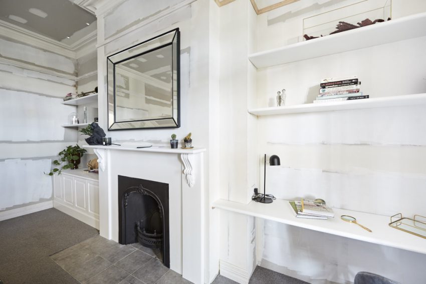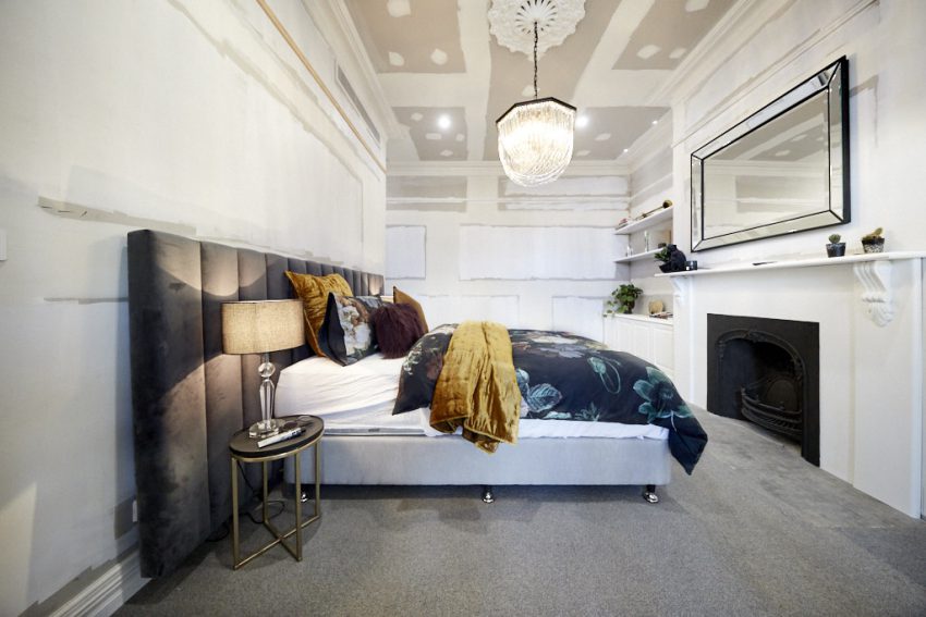 All three judges loved the simple, understated glamour of Matt and El’ise’s stylish guest bedroom, which came complete with a walk-in robe, ornate fireplace and one absolutely stunning pendant lamp. The couple chose plain white walls to offset their oversized slate-grey bedhead, which worked beautifully with the floral bedlinen, mustard velvet throw, brass bedside tables and ornate mirror above the fireplace. But, arguably, the biggest hero in the room came in the guise of that stunning pendant lamp, which all three judges absolutely adored.[/vc_column_text][/vc_column][/vc_row][vc_row][vc_column][vc_column_text]JESSE AND MEL