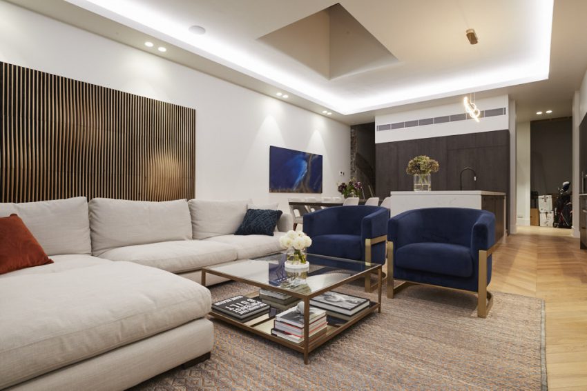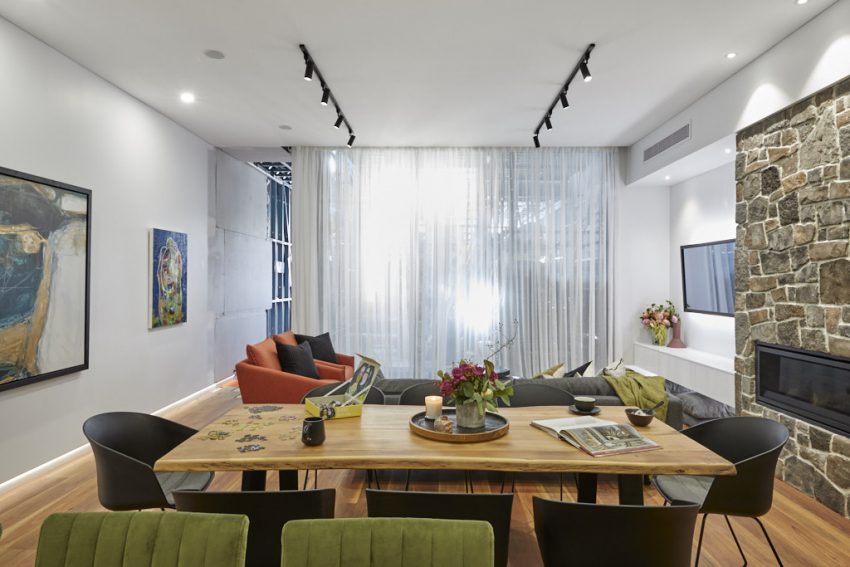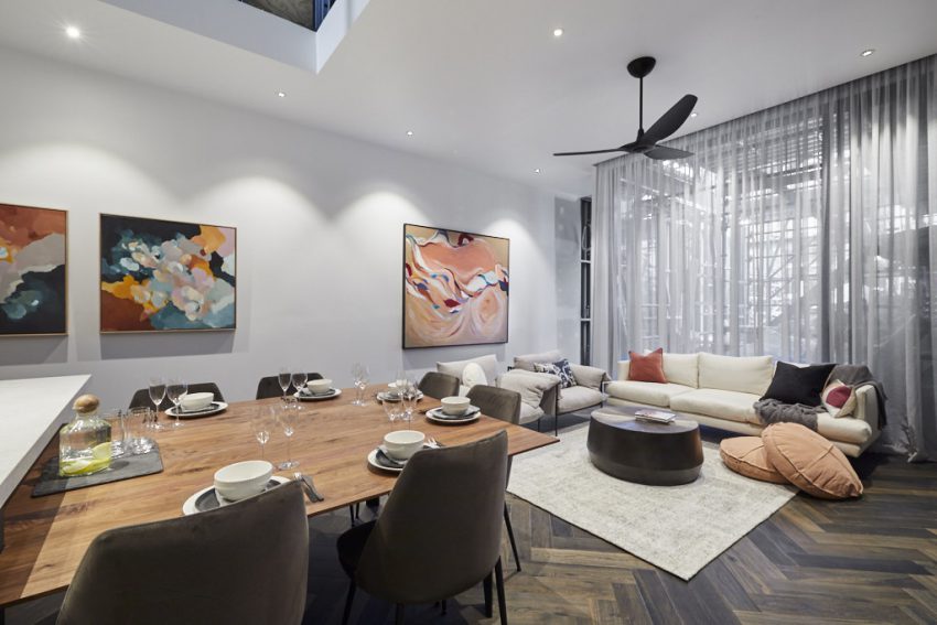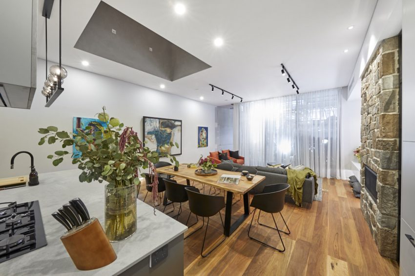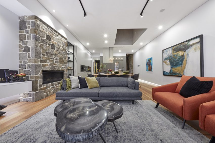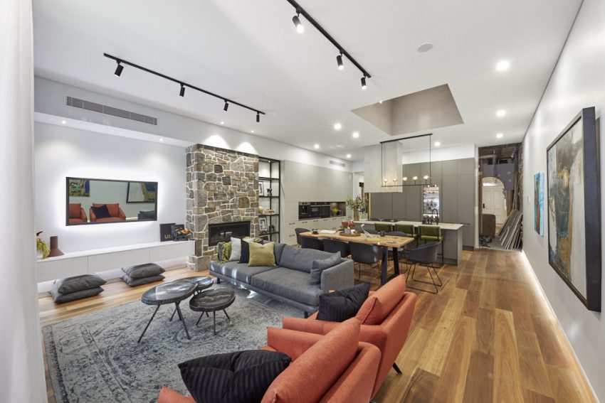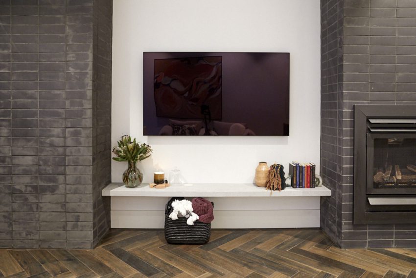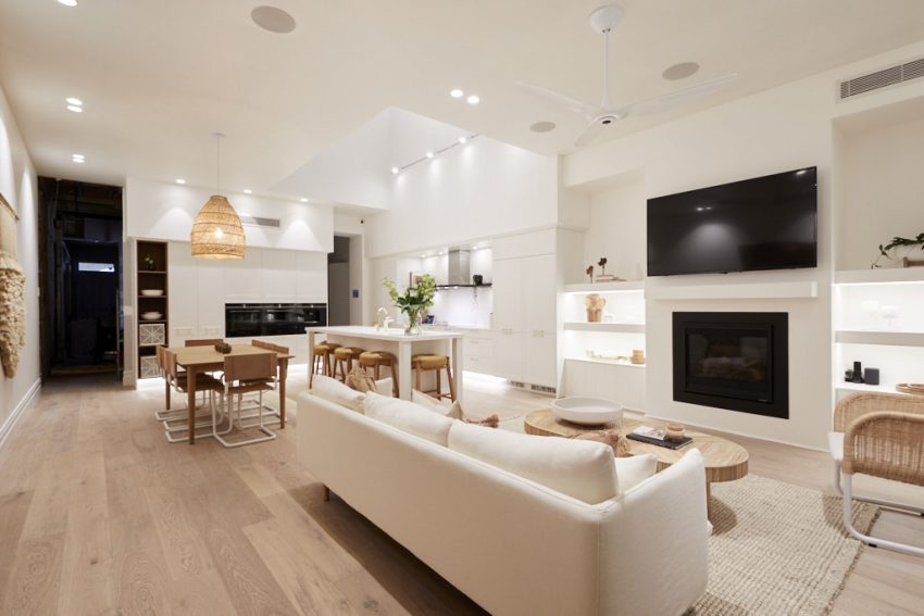 Elsewhere, they used a mellow palette of whites and creams, including an oversized cream couch, earth-toned circular coffee table, light-coloured rug and grey occasional chairs to work as a contrast to their black brick feature wall and fireplace. That wall, in turn, played beautifully with the light from their oversized void, which Shaynna said would prove a huge selling-point for their home.