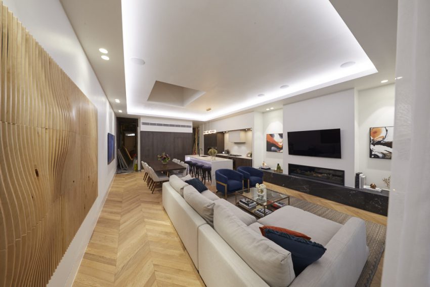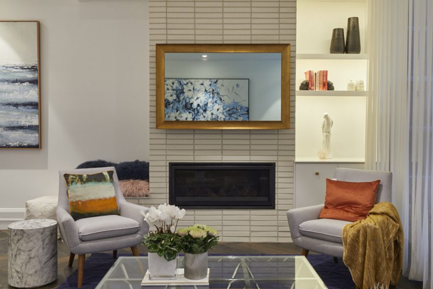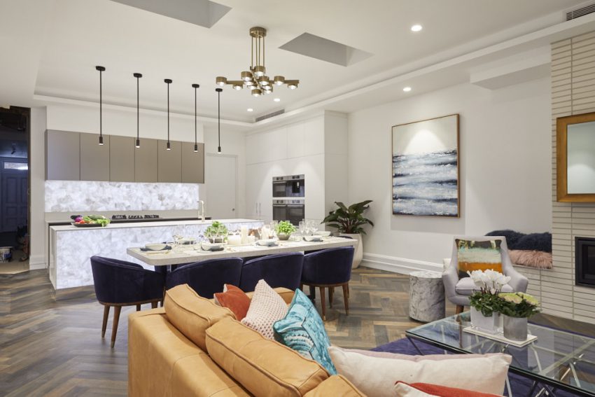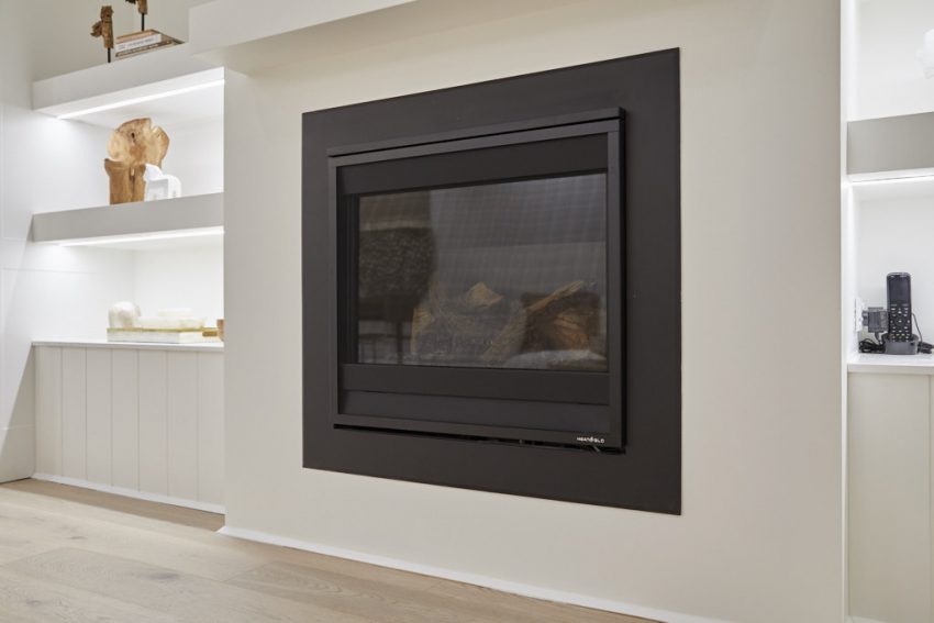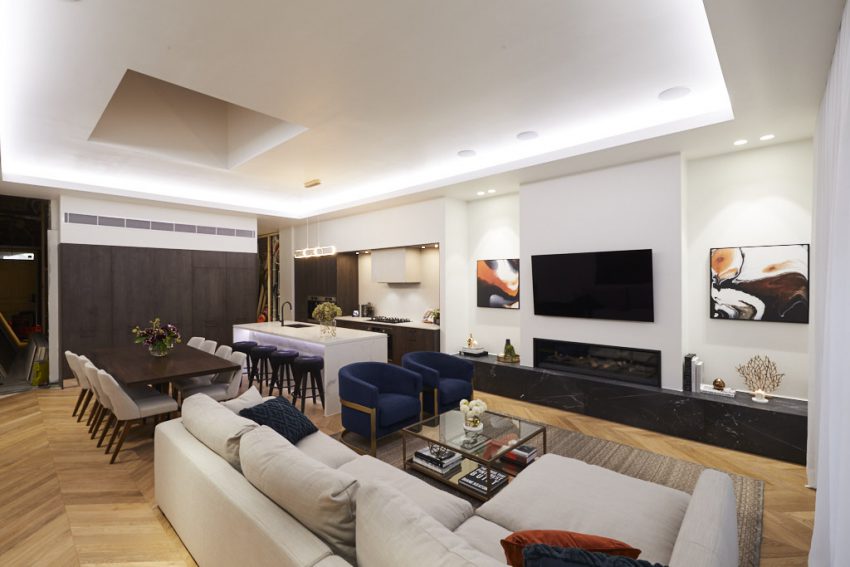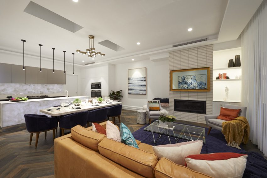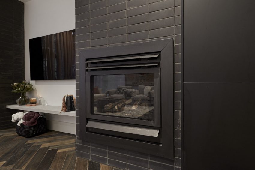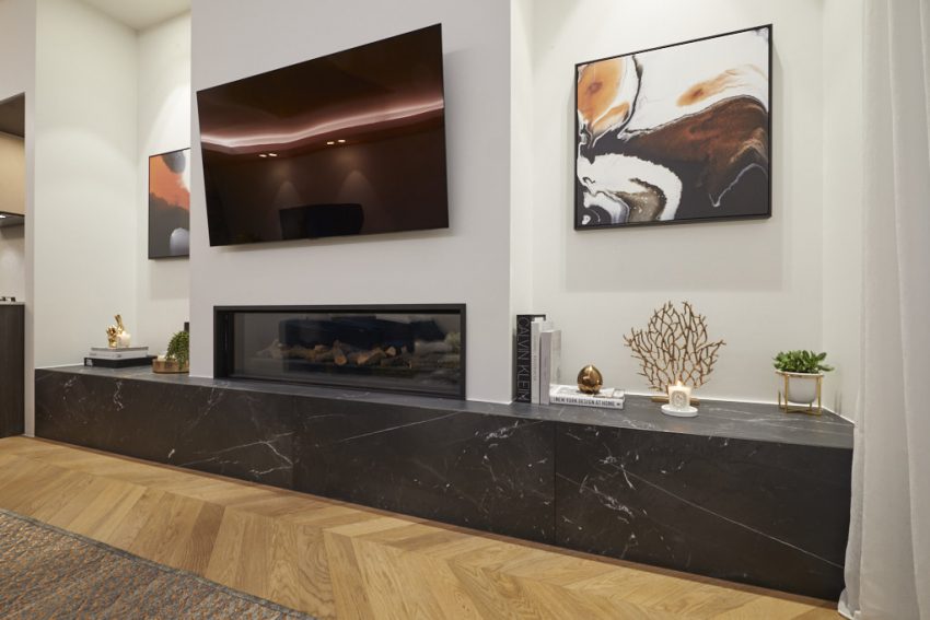 They particularly loved the fireplace, which the couple made to be the architectural focal point of the room by incorporating custom black marble benchtops and cabinetry. Unlike so many of the other couples, theirs was a fire that could be enjoyed while sitting in the oversized couch, or the two stunning blue occasional chairs, while still watching the television.