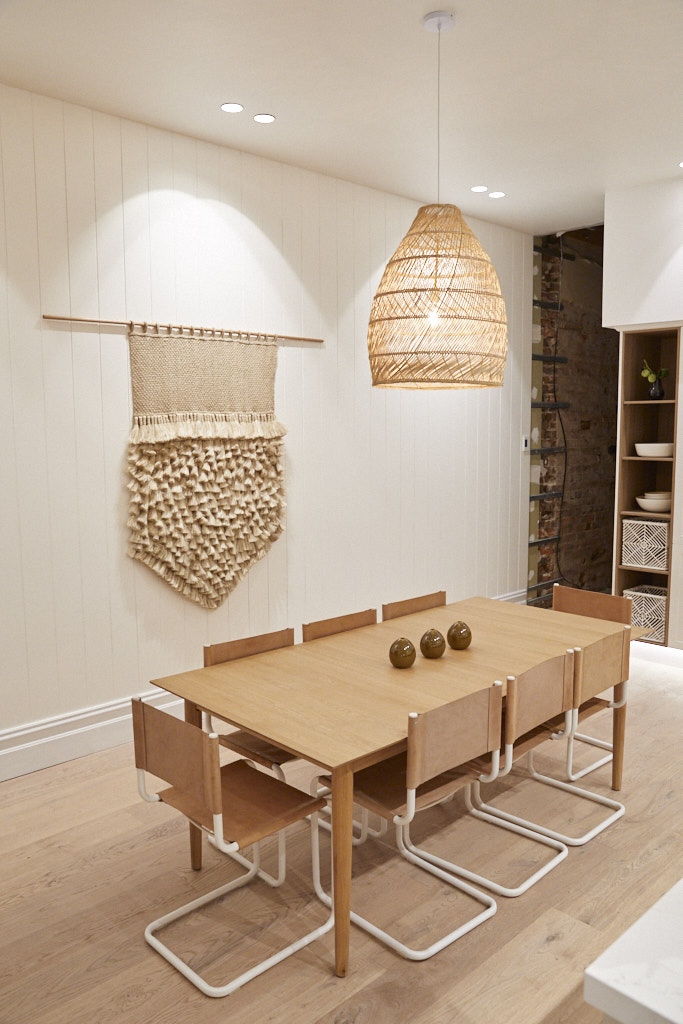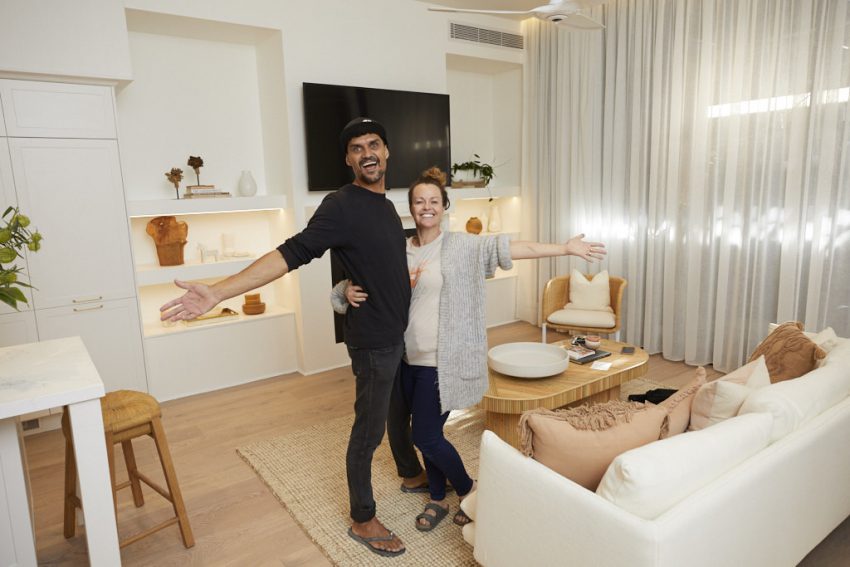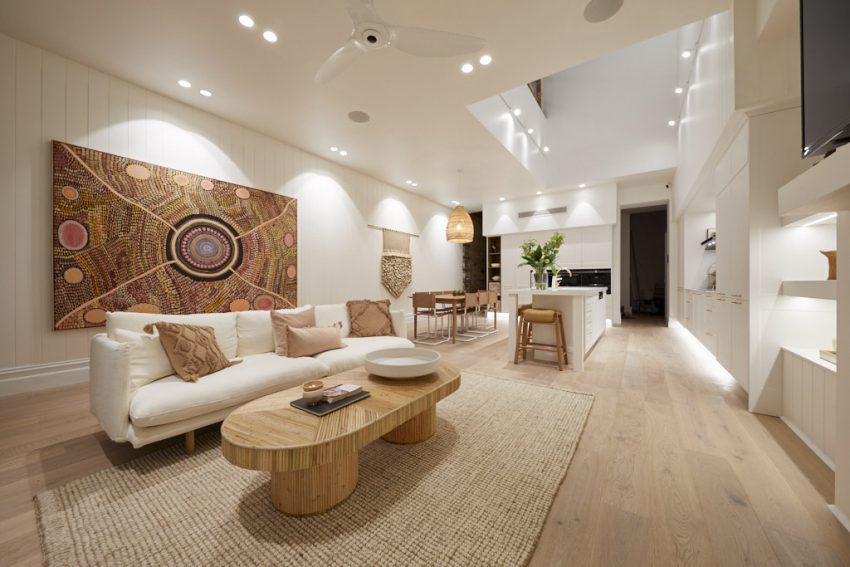 They particularly liked how everything flowed from the kitchen, as well as the placement of their large timber table and contemporary chairs, configured to run adjacent to their island bench. Neale loved their light, bright colour palette, cane coffee table, cane occasional chair, white in-built cabinetry and the white sofa and jute rug. But the thing that piqued his interest the most – and had all three judges rejoicing – was the placement of their stunning piece of commissioned Indigenous art.