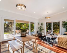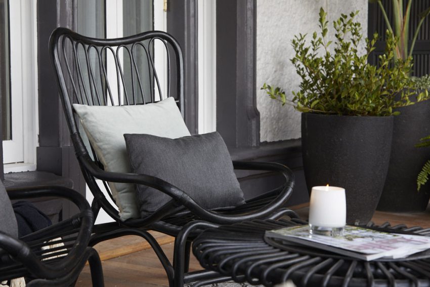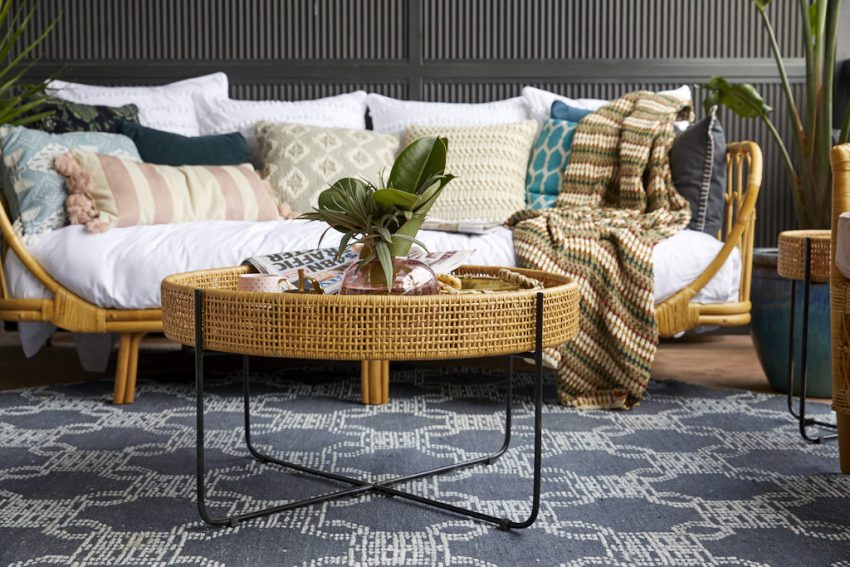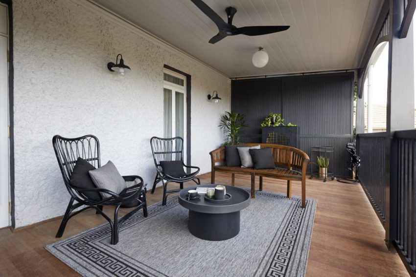 Andy and Deb veered away from their ‘coastal’ vibe this week, opting for a more industrial look for their Verandahs. Styling in muted greys and blacks, Deb says she wanted their furnishings, which included a couch, cane table, cane chairs, a circular rattan rug and a selection of large potted ferns to compliment the more toned down hues she’d used inside, to compliment the exterior.