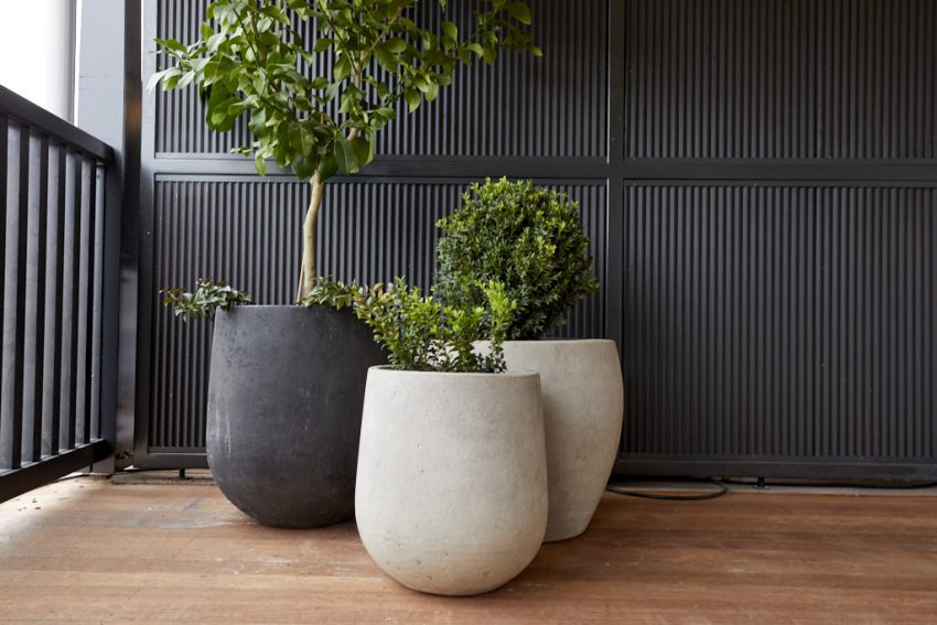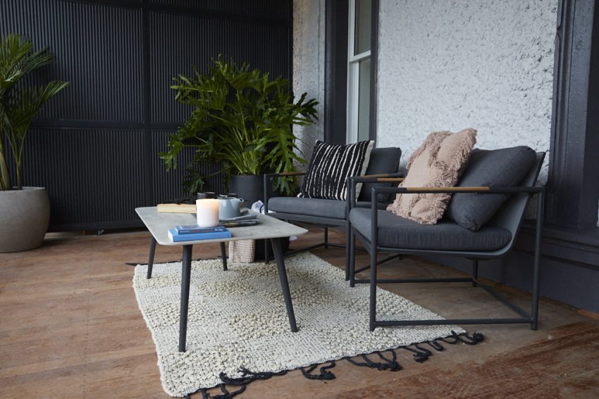 On Level Two, the couple opted for a relaxed, outdoor family area, including two occasional chairs, a bench seat, coffee table and large oversized floor rug. They dressed the space using charcoals, greys and creams, which worked perfectly against the gun-metal grey exterior paint used on the verandah woodwork and the colourbond dividing wall. Oversized plants in pots of grey and cream further accentuated the modern, luxe look.