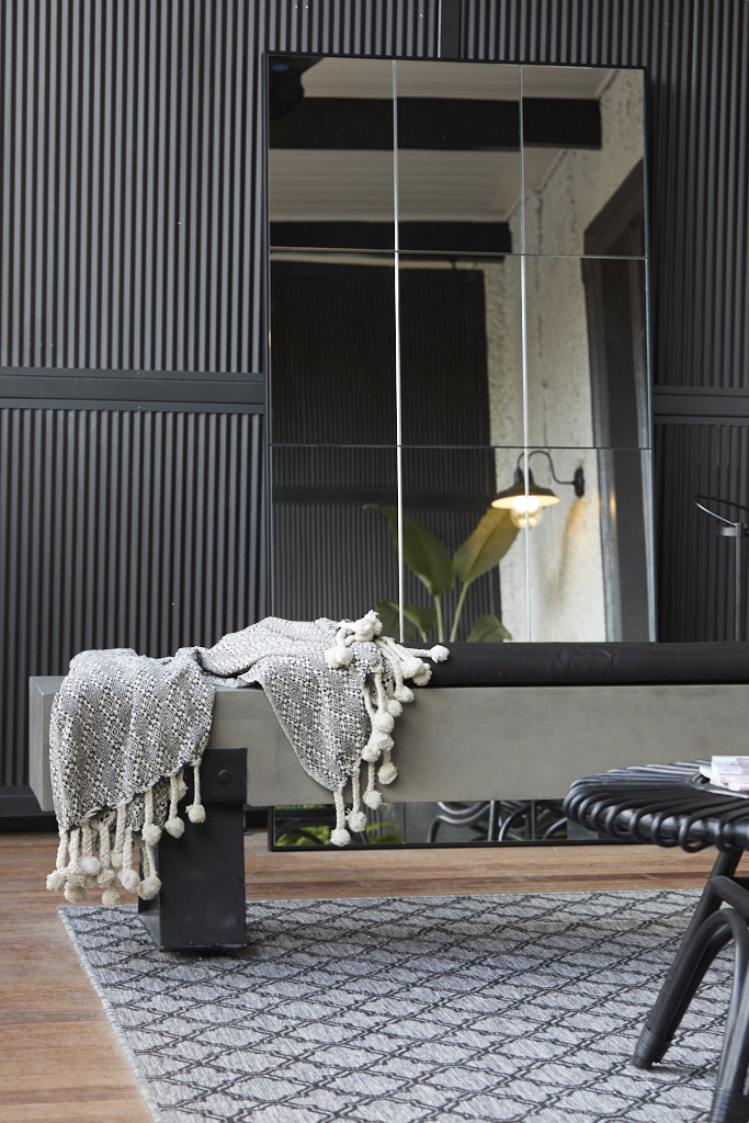 Upstairs off the main bedroom, the space had a softer feel than below, with Deb opting to incorporate a large, overstuffed white couch, huge rattan rug, large black cane occasional chairs, a timber bench, and more of their mature palms. A drinks trolley rounded out the look.