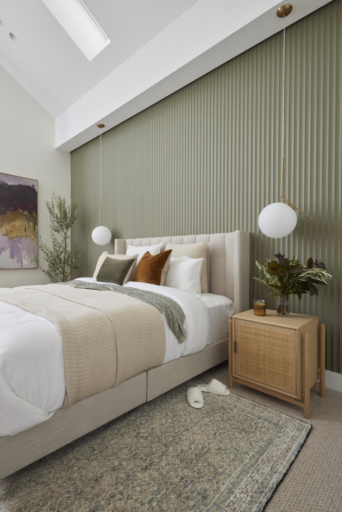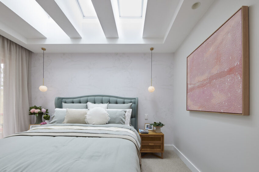 With its generous walk-in robe, balcony hinting at a secluded outdoor sanctuary and beautiful finish, Mitch and Mark’s master bedroom retreat showed the judges they’ve well and truly moved on in style and execution from their first Block! A traditional, yet contemporary room, they decided, with features such as ceiling a standout, drawing the eye to perfectly place pendants over ample tables franking a bed so beautifully styled Neale was left asking for tips. Foy Shaynna it was the artwork – matched to the bed – and colour palette that combined to scream Luxe!