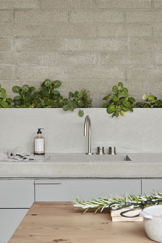 Natural light floods this kitchen, complemented by plenty of greenery and natural materials, embodying the biophilic design trend.