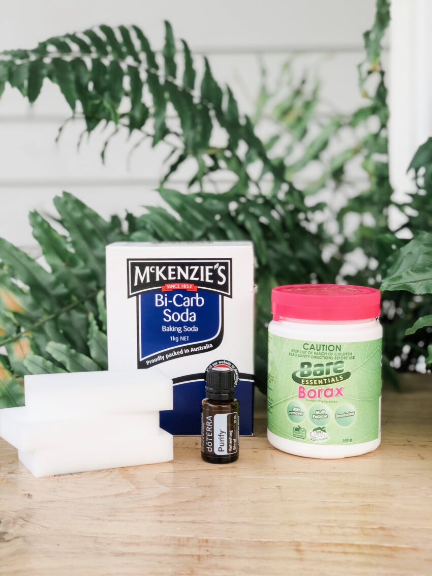 - Add baking soda, borax, hot water, and Purify oil to a container and mix until dissolved.
